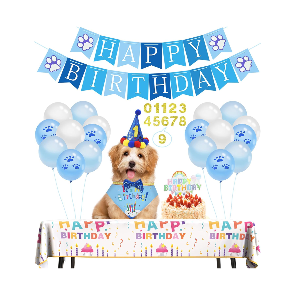 Complete Birthday Kit for Dogs – Make your pup’s big day extra special with this all-in-one party pack! Includes a HAPPY BIRTHDAY banner, BIRTHDAY BOY bandana, matching bow tie, party hat, 12 paw-print balloons, 10 number cutouts, a pet-themed tablecloth, and 100 glue dots for decorating.