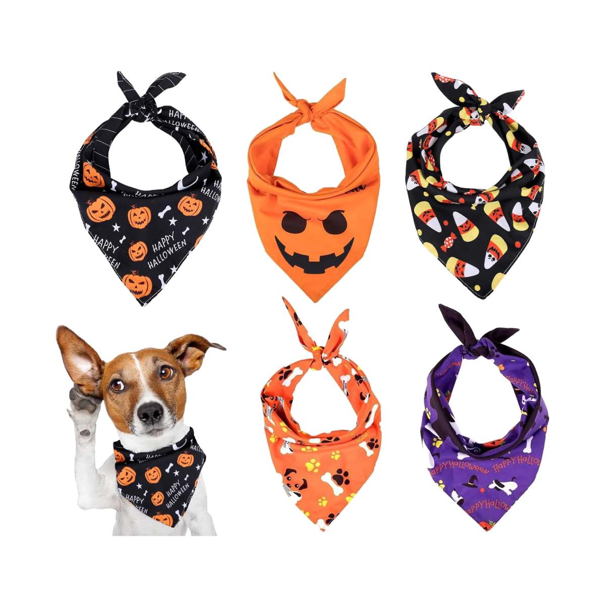 Featuring festive Halloween colors like black, orange, and purple, each pet scarf is printed with adorable designs such as pumpkins, ghosts, bones, and candy corn. These patterns give your pet a fun and eye-catching Halloween look.