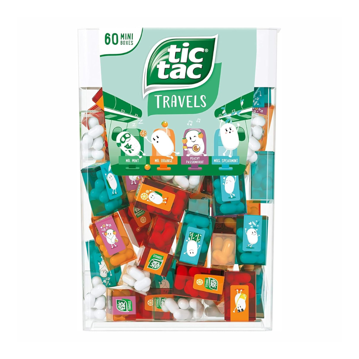 Enjoy a mix of refreshing flavors with this Tic Tac pack containing 60 mini boxes in mint orange, spearmint, peach, and passion fruit, 234g total.